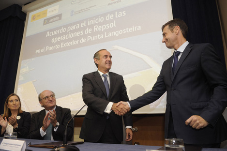 El presidente de la Autoridad Portuaria de A Coruña, Enrique Losada, firmó ayer con el representante de Repsol y director del Complejo Industrial en A Coruña, Luis Llamas, el acuerdo para el inicio de la actividad de la empresa petrolera en el Puerto Exterior de Punta Langosteira. En concreto se acordó el traslado de los tráficos de petróleo crudo, coque y azufre de la concesión actual a las nuevas instalaciones, lo cual supone en torno a un 60% del total de sus tráficos portuarios.El acto estuvo presidido por la ministra de Fomento, Ana Pastor, y estuvieron presentes los alcaldes de A Coruña y Arteixo, Carlos Negreira y Carlos Calvelo, respectivamente, así como la conselleira do Medio Rural e do Mar, Rosa Quintana; y diferentes autoridades y representantes institucionales. Por parte de Repsol asistió el presidente ejecutivo de la compañía, Antonio Brufau, junto a su equipo directivo. Por parte del Puerto acudieron los miembros del Consejo de Administración y el equipo directivo de la Autoridad Portuaria.