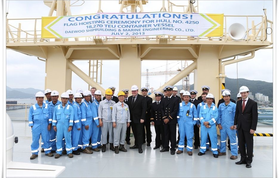 Tal y como es conocido y se destacaba en la pancarta conmemorativa del acto, el primer Triple-E sale de astilleros con una capacidad exacta para transportar 18.270 TEUs.