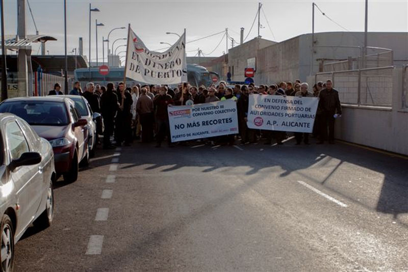 El III Convenio fue firmado en junio del 2012 por Puertos del Estado y los sindicatos, siendo invalidado por la Comisión Ejecutiva de la Comisión Interministerial de Retribuciones (CECIR), dependiente del Ministerio de Hacienda, el pasado mes de septiembre. Después de muchas reuniones entre Sindicatos, Puertos del Estado, Ministerio de Fomento y organizaciones políticas nacionales, la CECIR sigue bloqueando el convenio por lo que los trabajadores de los puertos españoles han decidido realizar los paros acordados.El paro de ayer fue secundado por el 100% de la plantilla que no tenía asignado servicios mínimos, siendo apoyados por trabajadores de los puertos de Valencia, Cartagena y Almería que acudieron desde sus respectivos puertos, igual que los trabajadores del Puerto de Alicante hicieron el pasado 14 de marzo apoyando al Puerto de Valencia, y harán el próximo 4 de abril apoyando al Puerto de Cartagena en sus paros.Según explica CC.OO., a las 8 de la mañana, con el comienzo de las dos horas de paro, se inició una manifestación que empezó en el barrio Heliodoro Madrona del Puerto de Alicante, desde donde los trabajadores de la Autoridad Portuaria marcharon pacíficamente hasta la entrada al puerto ubicada junto a la estación de autobuses de Alicante.En dicha entrada los trabajadores realizaron un paro de 30 minutos para posteriormente reanudar su marcha por los muelles de mercancías hasta llegar al acceso de Autovía del Puerto de Alicante, lugar donde volvieron a realizar otro paro de unos 30 minutos.Durante el tiempo que los trabajadores estuvieron en las puertas, los transportistas les dieron muestras de ánimo, tras ser informados de los motivos de dicho paro, incluso alguno de ellos ralentizaron el acceso al puerto en apoyo a los manifestantes.Como consecuencia de la manifestación hubo grandes retenciones de tráfico a la salida de los autobuses de la estación, así como en la Avenida de Elche, N-332 y la Autovía, A-31. Por lo que tuvieron que intervenir la policía local y la guardia civil de trafico para evitar mayores retenciones."Este Comité de Empresa informa que seguirá con el calendario de movilizaciones, mientras no se apruebe el III Convenio Colectivo, realizando el día 3 de abril, una concentración en la puerta del edifico de la Autoridad Portuaria de Alicante y los días 8, 9 y 10 un encierro de 3 días en las oficinas de la Autoridad Portuaria de Alicante", concluye el sindicato.