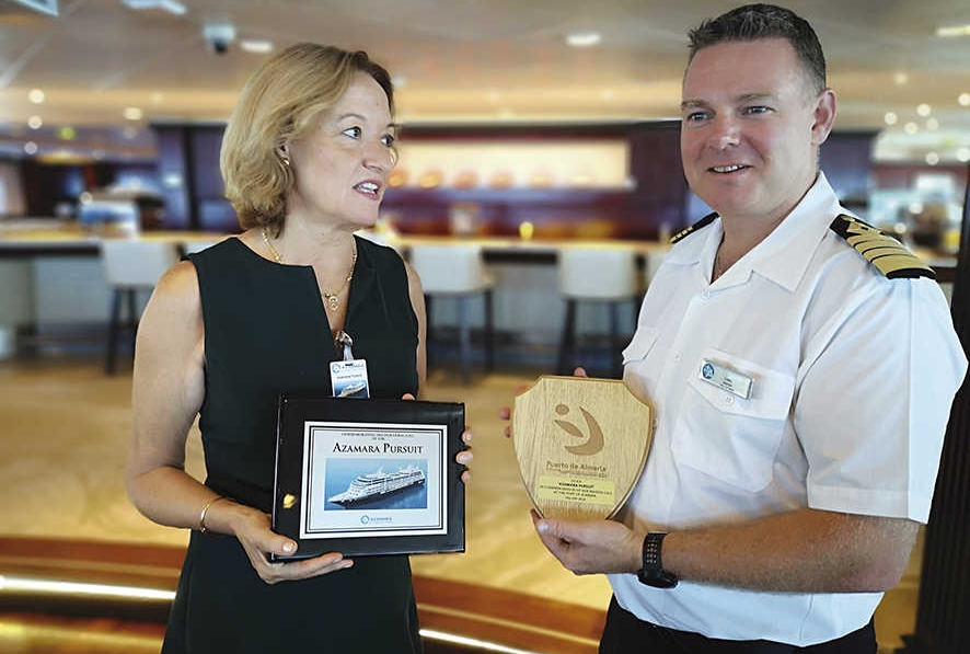 Por su parte, el capitán ofreció a la presidenta un recuerdo conmemorativo de la inauguración del crucero, que tras una profunda remodelación, reanudó su actividad el pasado mes de marzo. Tras el acto de bienvenida, Ortiz realizó un recorrido por algunas de las instalaciones más emblemáticas del nuevo "Azamara Pursuit", un buque de la línea de lujo Azamara Club Cruises de la naviera Royal Caribbean. El crucero llegó ayer a Almería procedente de Gibraltar. Su próxima escala será Valencia. En él viajan casi 700 turistas, principalmente de Estados Unidos y de Reino Unido, y unos 400 tripulantes, que salieron el 30 de agosto del puerto de Southampton. Este es el tercer crucero que hace escala en septiembre en Almería, mes en el que pasarán por la ciudad 6 buques.