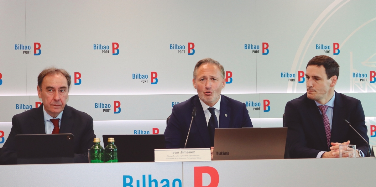 Desde la izquierda: Antonio Aiz, director de la Autoridad Portuaria de Bilbao; Iván Jiménez, presidente; Andima Ormaetxe, director de Operaciones, Comercial y Logística. Foto J.P.