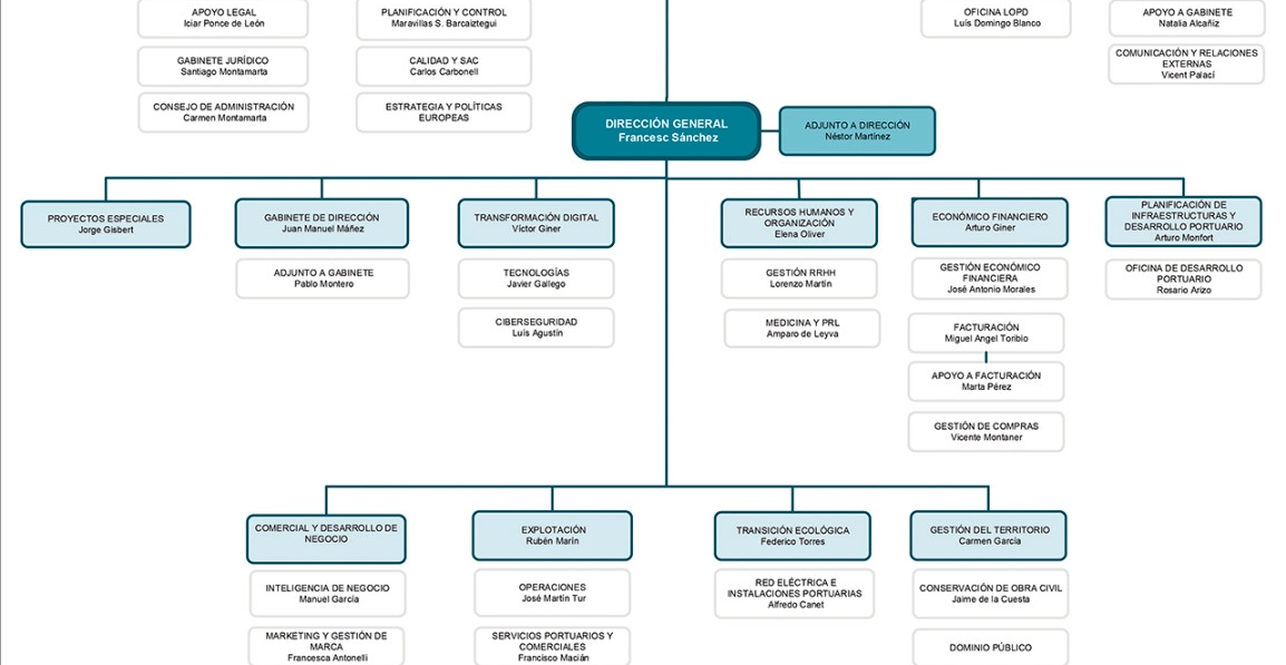 Elena Oliver se mantiene al frente del Departamento de Recursos Humanos, mientras que Fernando Giner sigue dirigiendo el Departamento Económico-Financiero. Arturo Monfort sigue al frente del Departamento de Planificación de Infraestructuras y Desarrollo Portuario.