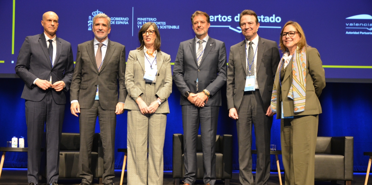 Víctor Jiménez, representante de España ante la OMI; Adolfo Utor, presidente de Baleària; Nieves Roqueñí, presidenta de la Autoridad Portuaria de Gijón; Ignacio Ballester, subdirector general de MSC España; Arturo Gonzalo, CEO de Enagás y Alice Acuña, vicepresidenta ejecutiva de Moeve Trading & Commercial Integration. Foto J.C.P.