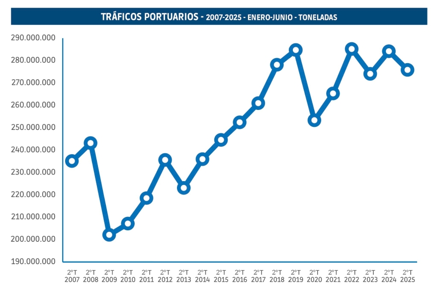 Con estos ratios, al cierre del primer semestre del año los puertos españoles redujeron su tráfico un 2,9% hasta los 275,8 millones de toneladas, con un descenso del 5,4% de los graneles líquidos, del 4,7% de los sólidos y del 0,5% de la mercancía general.