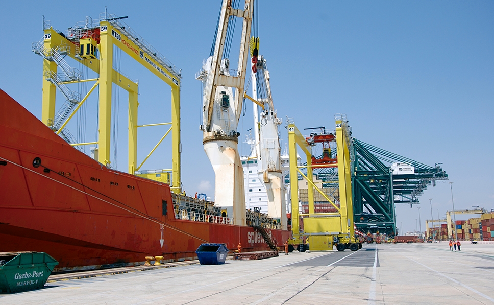 Un momento de la operativa de descarga de los RTGs Konekranes que han llegado semimontados. Foto Héctor Das.