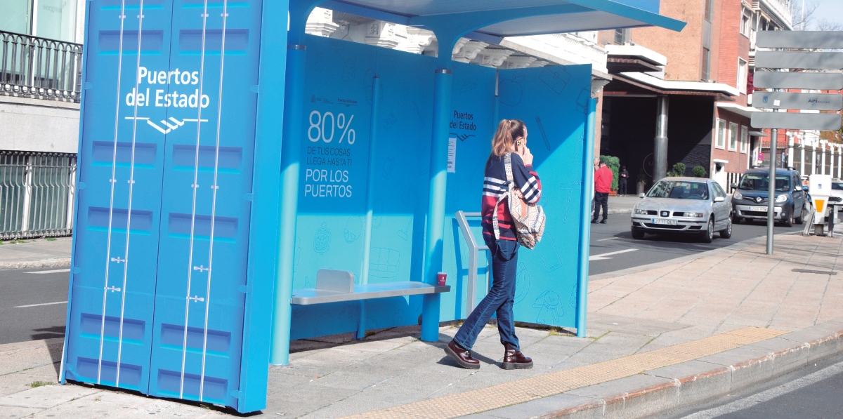Detalle de una de las marquesinas de transporte público que forman parte de la campaña en Madrid de Puertos del Estado. Foto M.C.