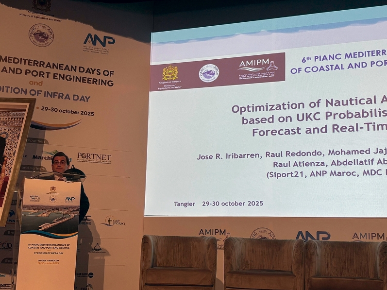VALENCIA. Siport21, en colaboración con MDC Ingénierie (Marruecos), presentó un estudio centrado en la optimización del acceso náutico de los buques a los puertos mediante el análisis probabilístico del resguardo bajo quilla (UKC). La investigación introduce una metodología transformadora, certificada por DNV, que mejora la operatividad y la seguridad portuaria para el acceso de grandes buques que navegan bajo condiciones ambientales complejas.