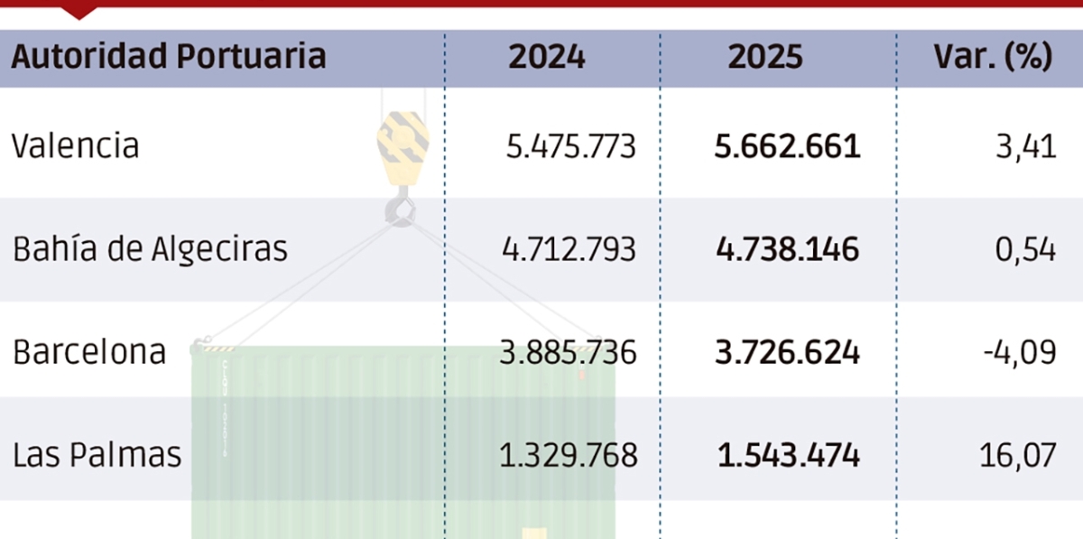 Los puertos españoles gestionaron en 2025 un total de 18,61 millones de TEUs, lo que representa un crecimiento del 2,7%, gracias principalmente a la buena evolución del tráfico import-export. ...