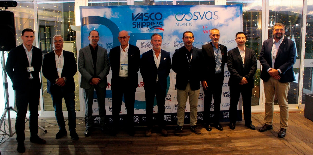 Representantes de Vasco Shipping Services, Grupo VASCO, COSCO Shipping Lines Spain, Autoridad Portuaria de Bilbao, UniportBilbao y Diputación Foral de Bizkaia, durante el acto celebrado la tarde-noche del viernes en Bilbao. Foto J.P.