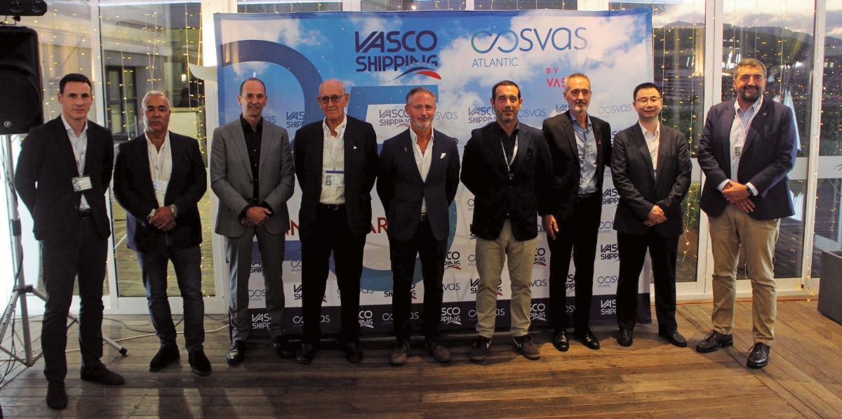 Representantes de Vasco Shipping Services, Grupo VASCO, COSCO Shipping Lines Spain, Autoridad Portuaria de Bilbao, UniportBilbao y Diputación Foral de Bizkaia, durante el acto celebrado la tarde-noche del viernes en Bilbao. Foto J.P.