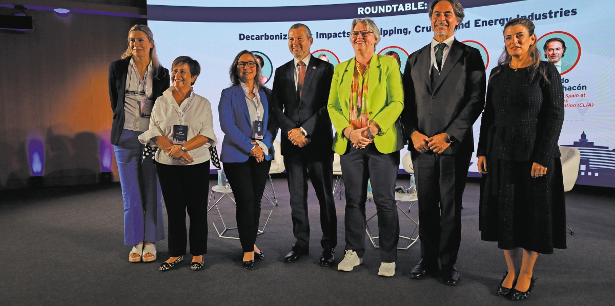De izquierda a derecha: Rosana Velasco (WISTA Spain), Ruth Breitenfeld, Alice Acuña (Moeve), Arsenio Domínguez (OMI), Karin Orsel (MF Shipping), Alfredo Serrano (CLIA España) y Elpa Petraki (WISTA International). Foto: J. M.